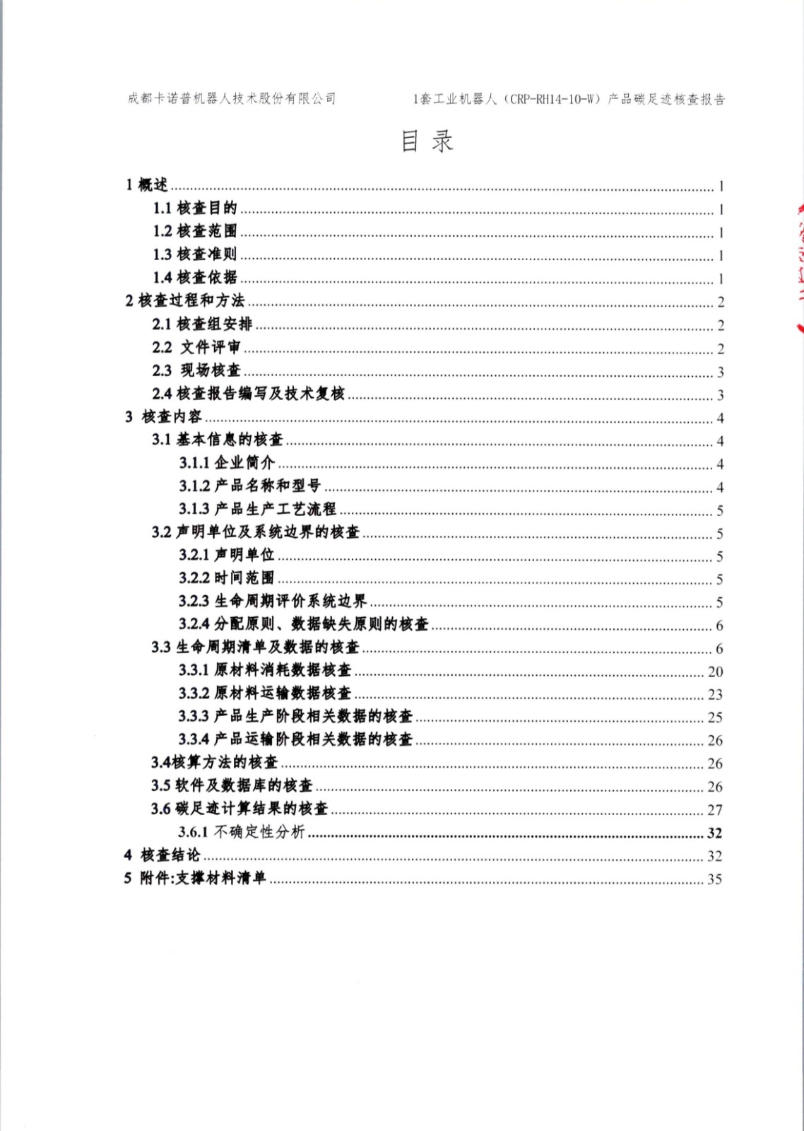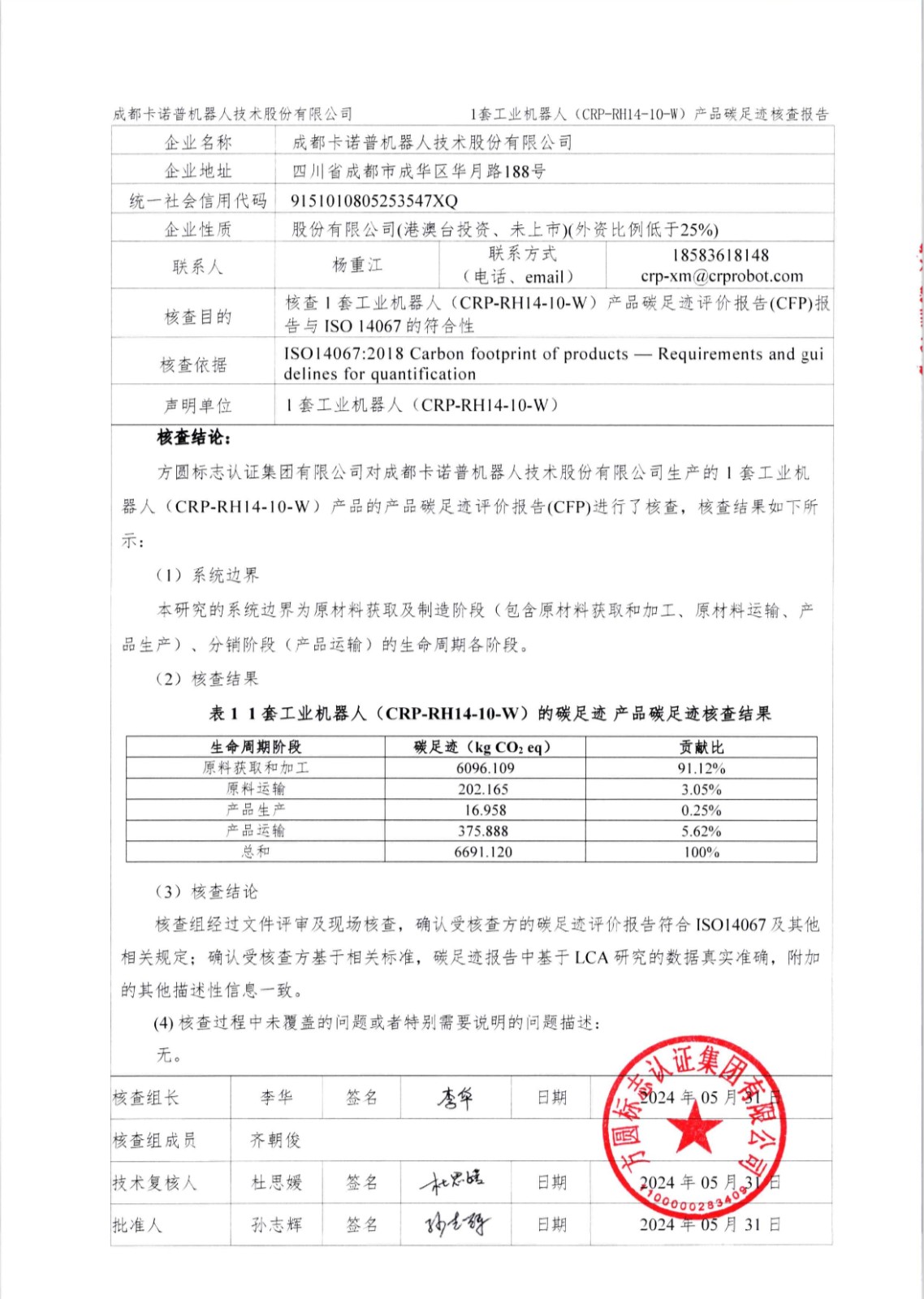成都星空電競機器人技術(shù)股份有限公司1套工業(yè)機器人(CRP-RH14-10-W)產(chǎn)品碳足跡第三方核查報告
