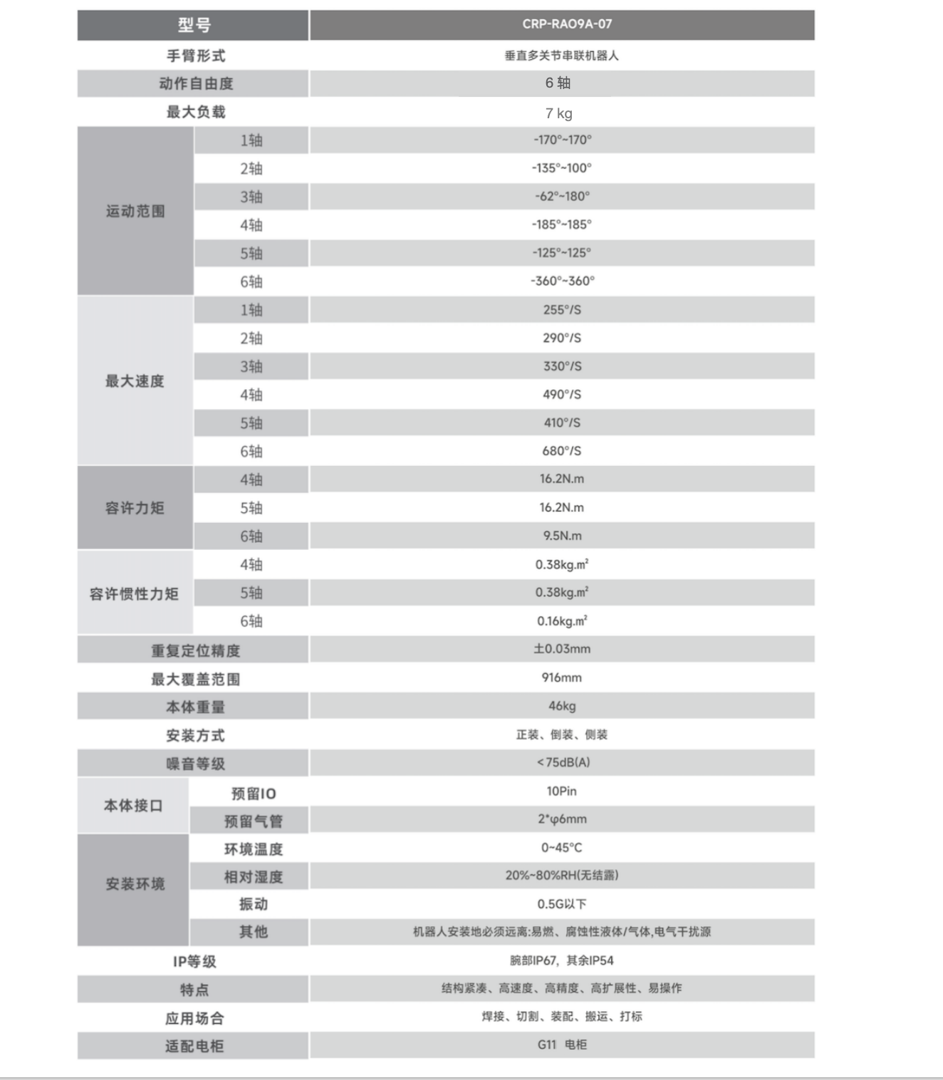 臂長(cháng)916mm,手腕負載容量大,額定負載7kg,可輕松應對多種應用場(chǎng)合。